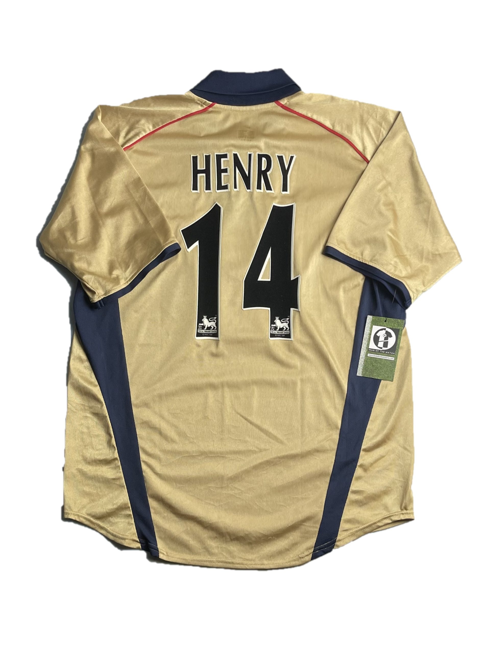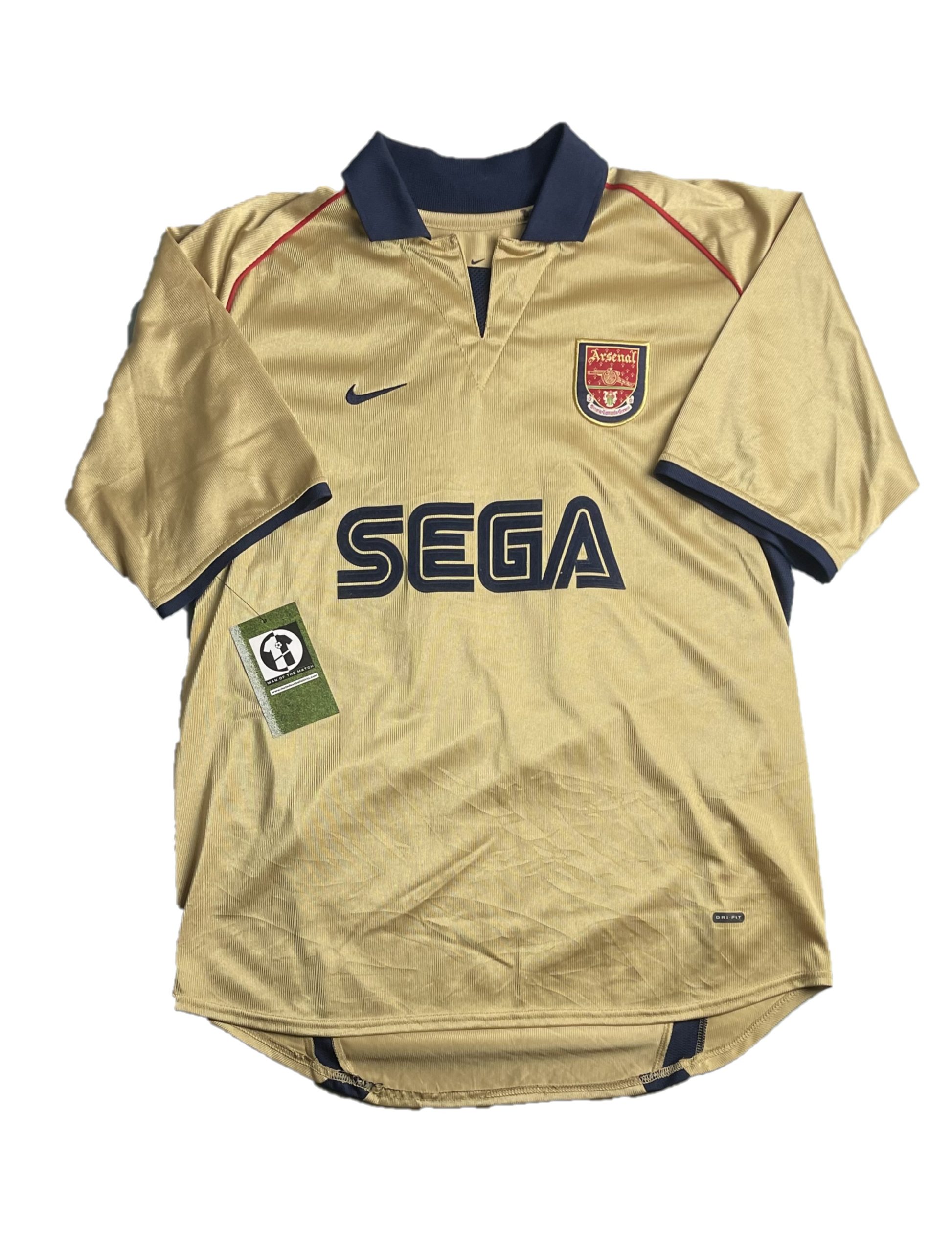Away shirt as worn during the historic 2001/02 Double-winning campaign, a season that saw Arsenal reclaim the Premier League title and lift the FA Cup. The design is famously rendered in a metallic “Gold” with navy accents, featuring the iconic “SEGA” sponsorship that defined the club’s look at the turn of the millennium. This kit is forever etched into Gunners folklore as the shirt worn at Old Trafford when Sylvain Wiltord’s strike secured the league title on enemy territory, capping a season of dominance led by the French flair of Thierry Henry and Robert Pires.
