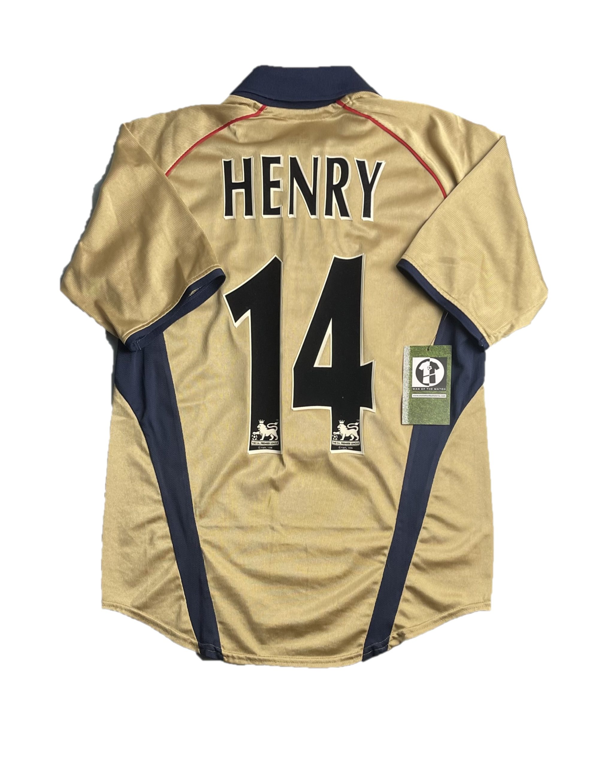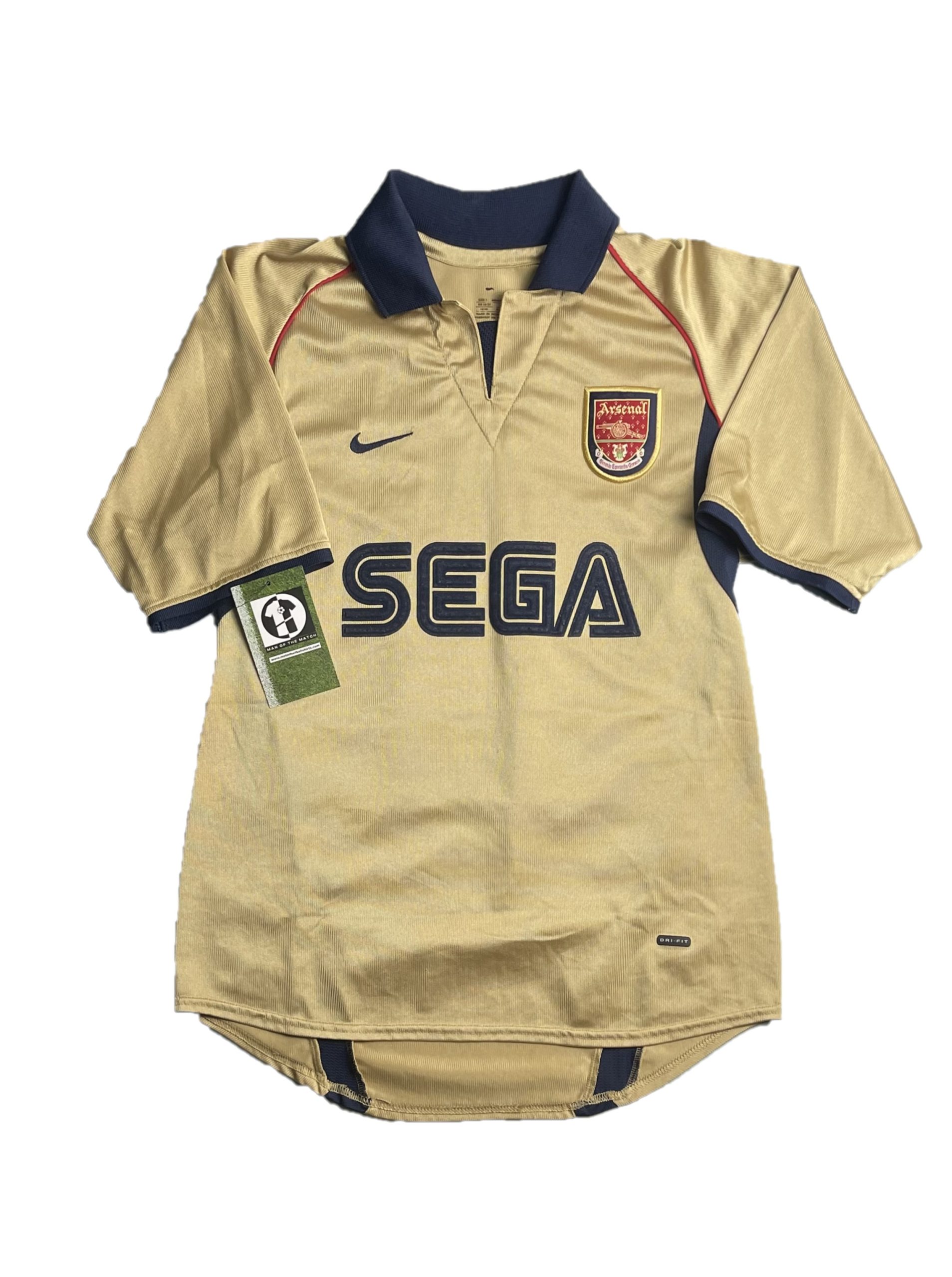 Away shirt as worn during the historic 2001/02 Double-winning campaign, a season that saw Arsenal reclaim the Premier League title and lift the FA Cup. The design is famously rendered in a metallic “Gold” with navy accents, featuring the iconic “SEGA” sponsorship that defined the club’s look at the turn of the millennium. This kit is forever etched into Gunners folklore as the shirt worn at Old Trafford when Sylvain Wiltord’s strike secured the league title on enemy territory, capping a season of dominance led by the French flair of Thierry Henry and Robert Pires.