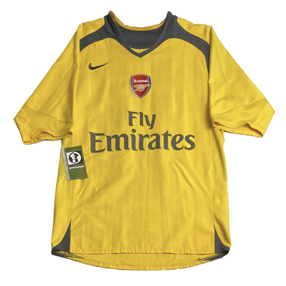 Away shirt as worn during the club’s inaugural season at the Emirates Stadium, a campaign that saw Arsène Wenger’s side finish 4th in the Premier League and reach the League Cup Final. The design features a sharp yellow base with grey “Flint” accents and navy blue trim, marking the first away shirt to feature the new “Fly Emirates” sponsorship. This kit was worn during a period of tactical transition as the “Young Guns” era took shape, featuring the final Arsenal season of Thierry Henry alongside the rising influence of Robin van Persie, Cesc Fàbregas, and Tomas Rosicky.