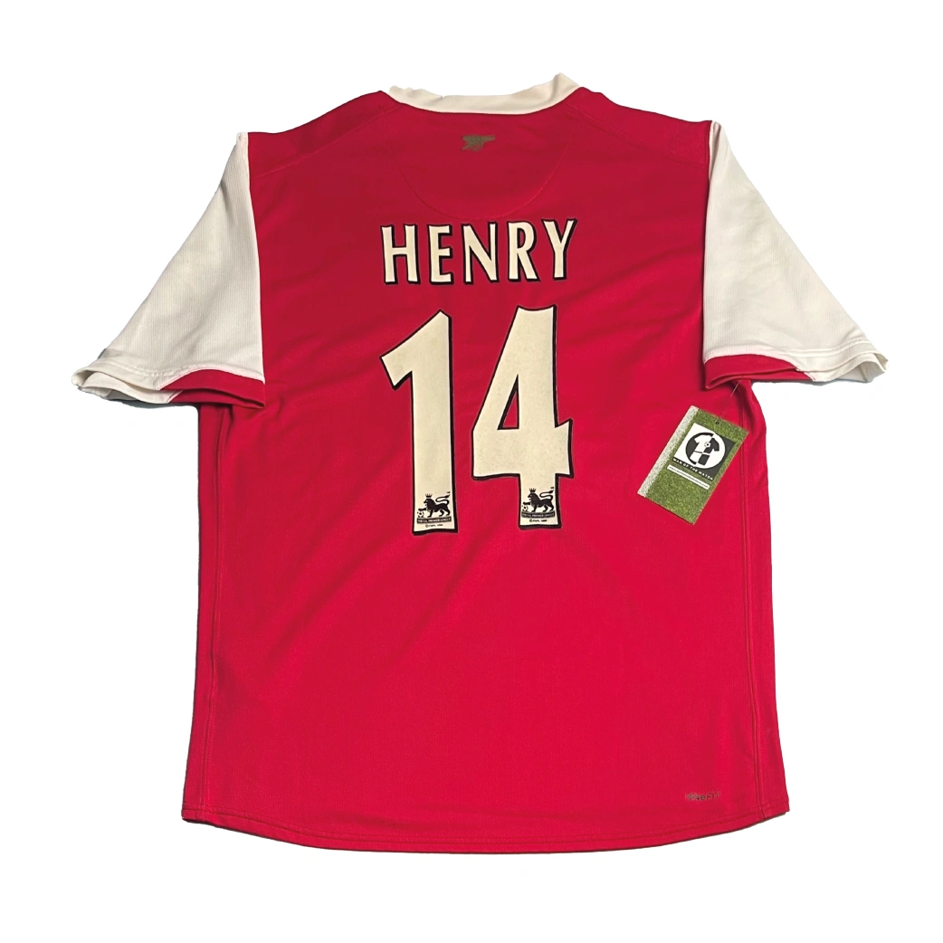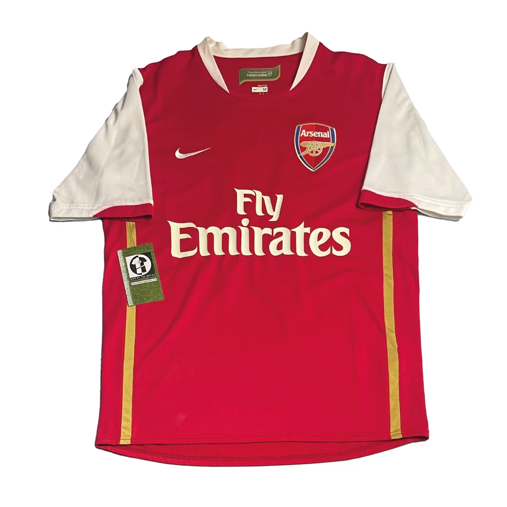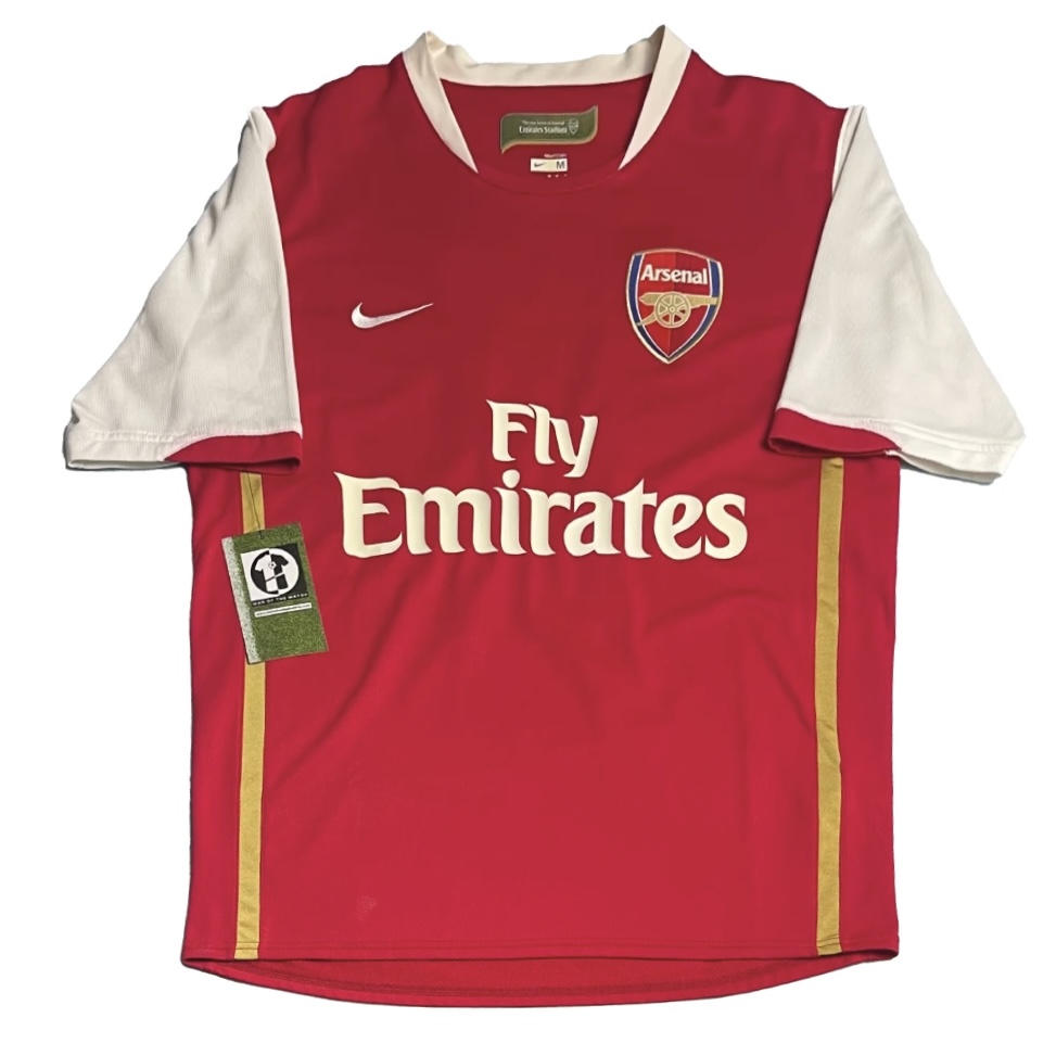Home shirt as worn during the historic inaugural season at the Emirates Stadium, as Arsenal moved from their beloved Highbury home into a new era. The design features the traditional red and white colors but introduces a more modern aesthetic with gold piping and the debut of the “Fly Emirates” sponsorship. This campaign saw Arsène Wenger’s side reach the League Cup Final and navigate a season of transition, highlighted by the continued brilliance of Cesc Fàbregas and the final goals of club legend Thierry Henry before his departure to Barcelona.