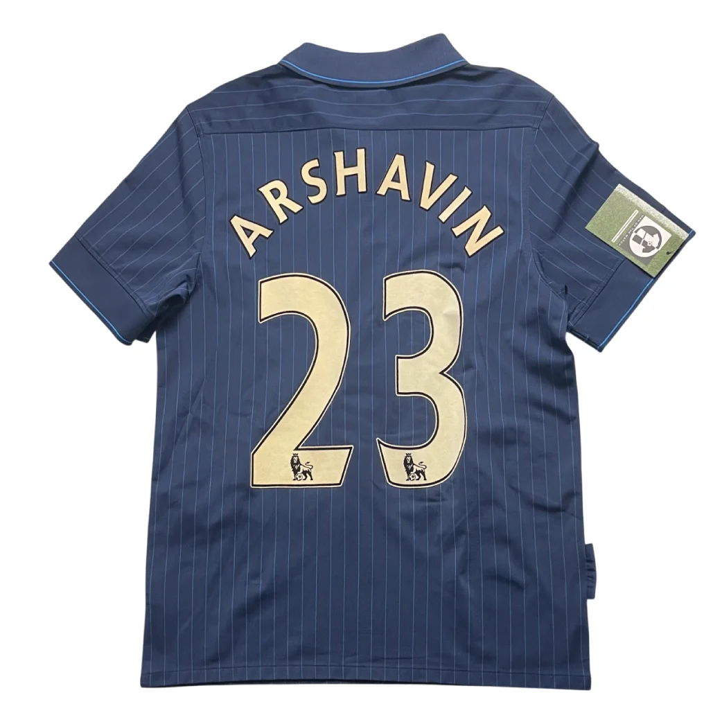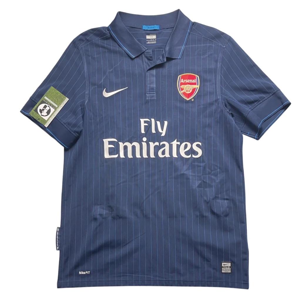 Away shirt as worn during a high-octane 2009/10 campaign as Arsenal challenged for the Premier League title and reached the quarter-finals of the UEFA Champions League. The design features a sophisticated “Midnight Navy” base with subtle pinstripe detailing and a classic polo collar, a stylish homage to the club’s away kits from the 1920s. Under the visionary management of Arsène Wenger, this shirt was graced by the technical mastery of Cesc Fàbregas during his most prolific season, the emergence of Andrey Arshavin, and the clinical finishing of Robin van Persie, famously worn during the club’s dramatic European nights and dominant away victories across England.