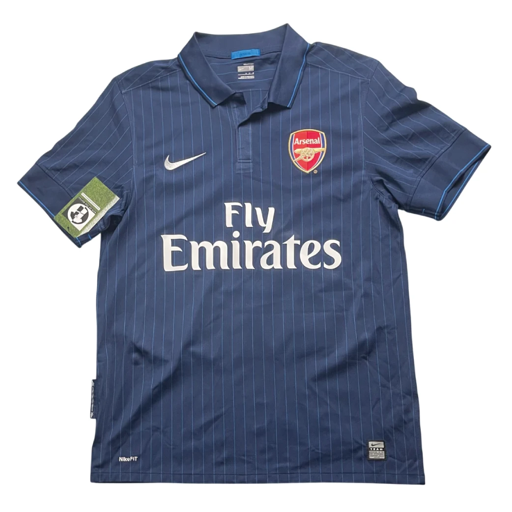 Away shirt as worn during a high-octane 2009/10 campaign as Arsenal challenged for the Premier League title and reached the quarter-finals of the UEFA Champions League. The design features a sophisticated “Midnight Navy” base with subtle pinstripe detailing and a classic polo collar, a stylish homage to the club’s away kits from the 1920s. Under the visionary management of Arsène Wenger, this shirt was graced by the technical mastery of Cesc Fàbregas during his most prolific season, the emergence of Andrey Arshavin, and the clinical finishing of Robin van Persie, famously worn during the club’s dramatic European nights and dominant away victories across England.