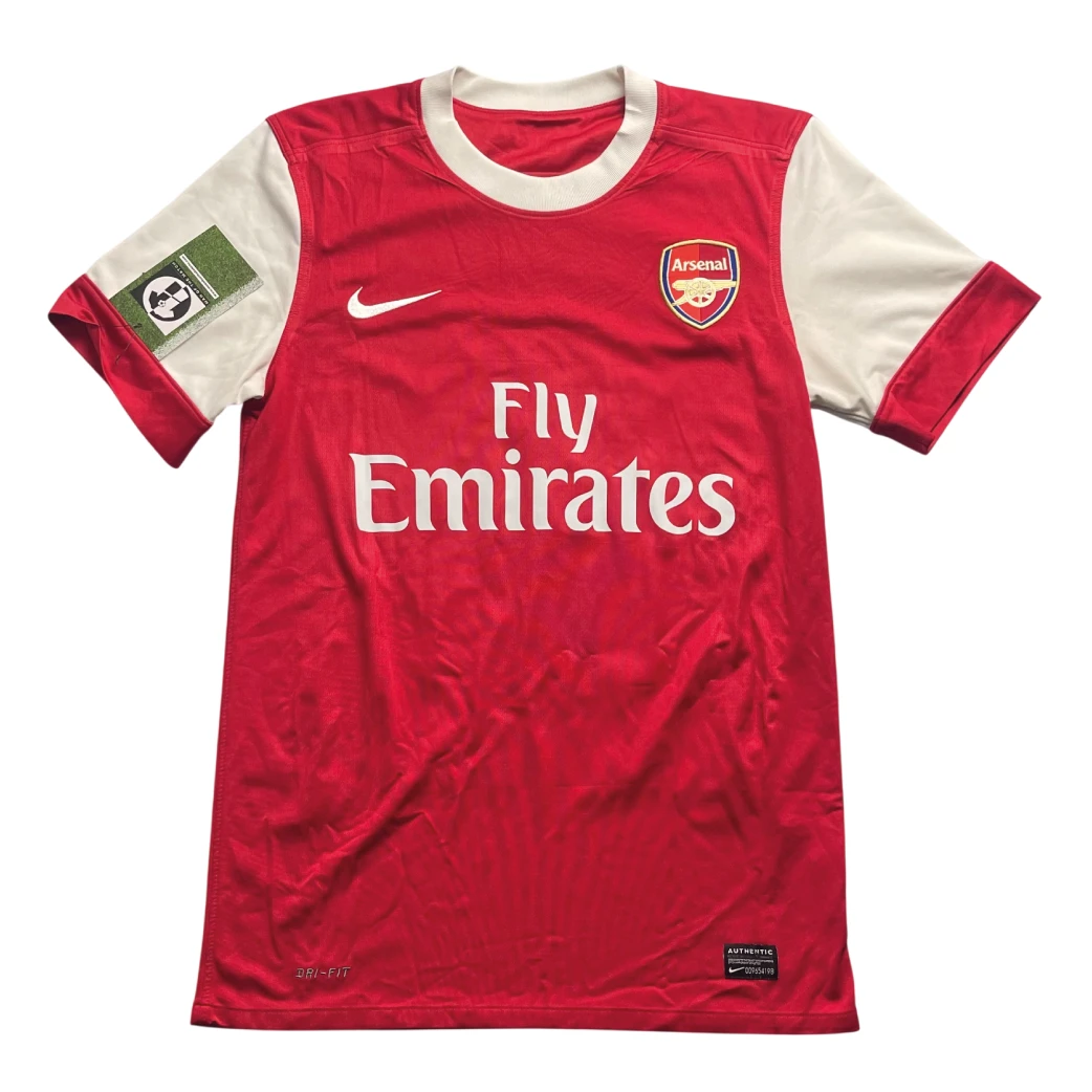 Home shirt as worn during a prolific 2010/11 campaign that saw Arsenal compete on all four fronts and secure a memorable Champions League victory over Barcelona at the Emirates. The design features a vibrant “Victory Red” body with iconic clean white sleeves and a classic ribbed crew neck, a retro-inspired aesthetic that celebrated the 40th anniversary of the club’s historic 1971 Double-winning season. Under the management of Arsène Wenger, this shirt was graced by the technical brilliance of Cesc Fàbregas, the breakout goal-scoring form of Robin van Persie, and the arrival of Moroccan flair in Marouane Chamakh, famously worn as the Gunners’ fluid attacking style earned them plaudits across Europe.