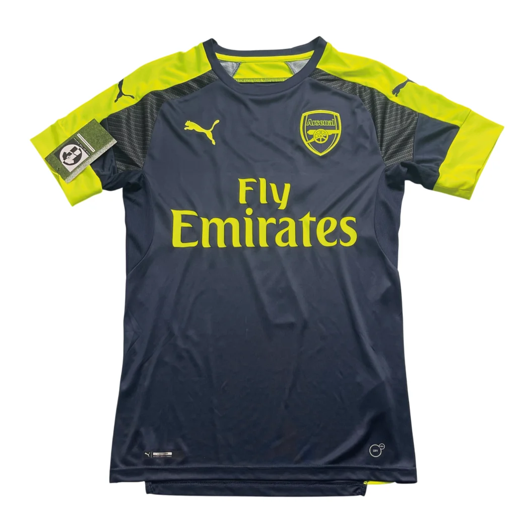 Third shirt as worn during a historic 2016/17 campaign that saw Arsenal lift a record-breaking 13th FA Cup trophy with a masterclass performance at Wembley. The design features a sophisticated “Peacoat Navy” base accented by vibrant “Safety Yellow” detailing—a modern, high-visibility aesthetic designed to stand out under the floodlights of Europe’s elite stadiums. Under the tactical leadership of Arsène Wenger, this shirt was graced by the electric pace of Alexis Sánchez and the clinical finishing of Theo Walcott, famously worn as the Gunners secured crucial victories during their 19th consecutive season in the Champions League.