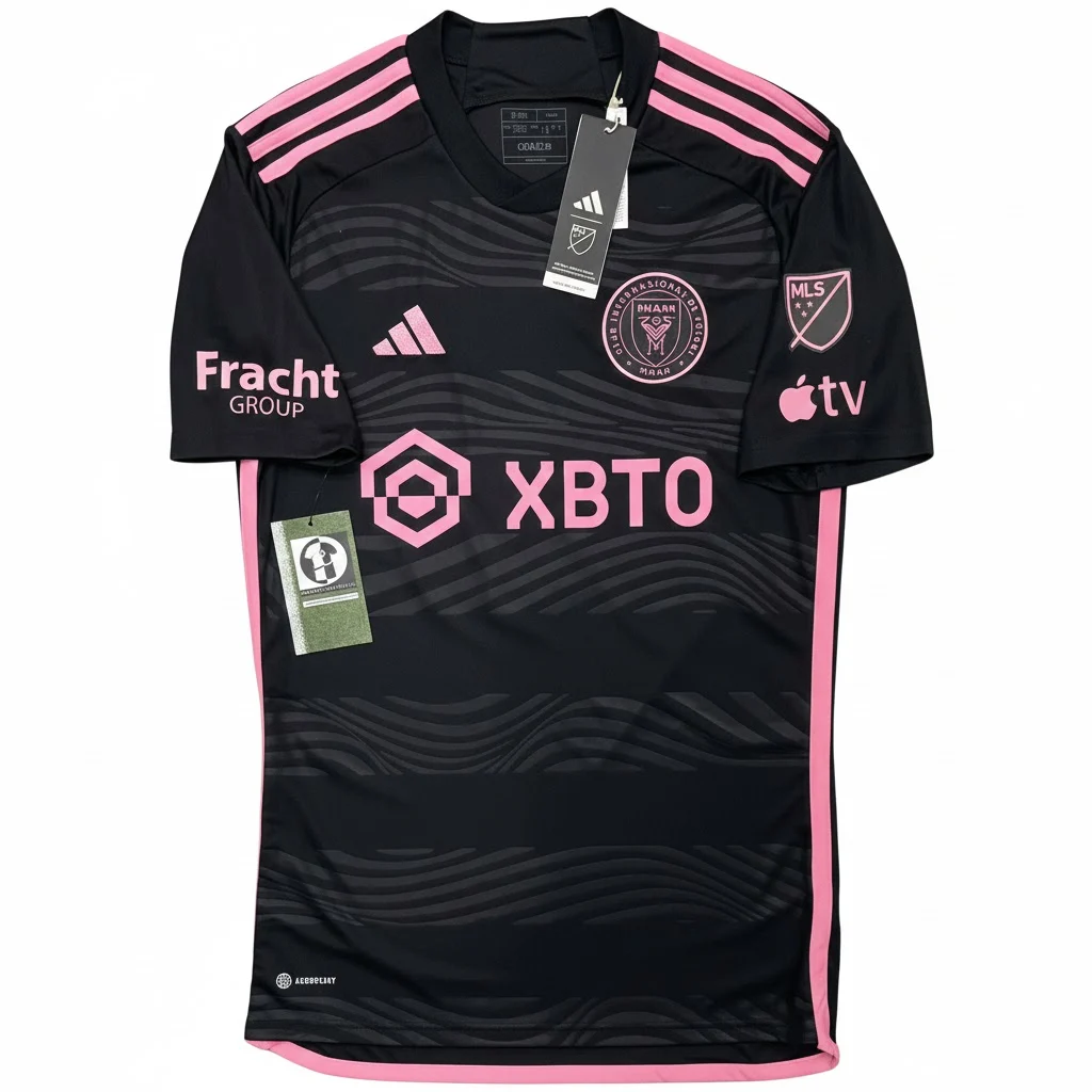 Away shirt as worn during the most significant season in the history of Major League Soccer, marked by the arrival of the legendary Lionel Messi. The “La Noche” design features a sleek black base with pink “pink wave” detailing, representing the energy of Miami at night. The kit became an instant icon as Messi led the club to its first-ever trophy, the 2023 Leagues Cup, scoring ten goals in just seven games and transforming the Herons into a global footballing powerhouse overnight.