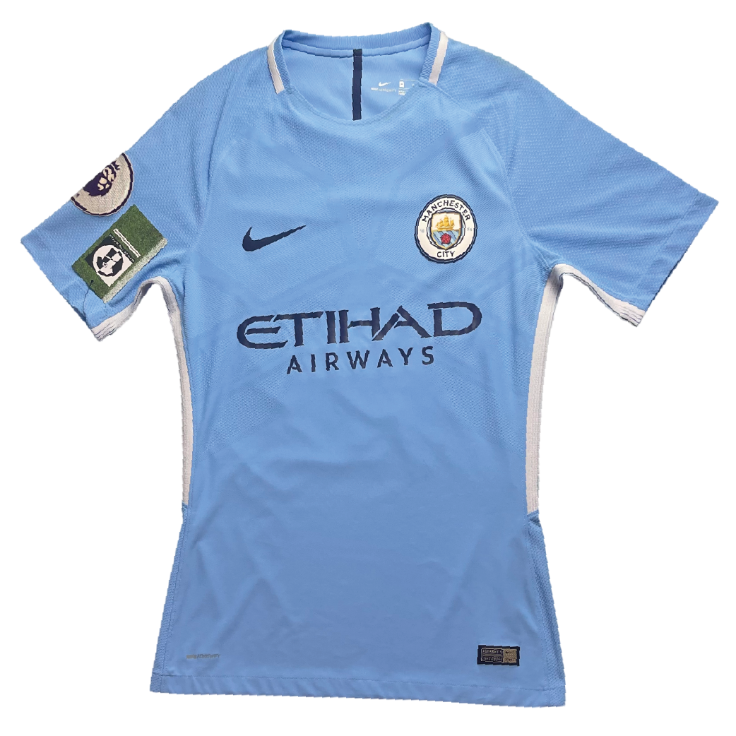 Home shirt as worn during an unprecedented 2017/18 campaign that saw Manchester City become the first club in Premier League history to reach 100 points. The design features a classic “Sky Blue” base with a sophisticated knit pattern on the sleeves, inspired by the Nike Vapor templates of the late 2010s. Under the tactical revolution of Pep Guardiola, this shirt was graced by a legendary squad featuring Kevin De Bruyne, Sergio Agüero, and David Silva, famously worn as the Cityzens dismantled the league scoring records and secured a dominant Premier League and League Cup double.