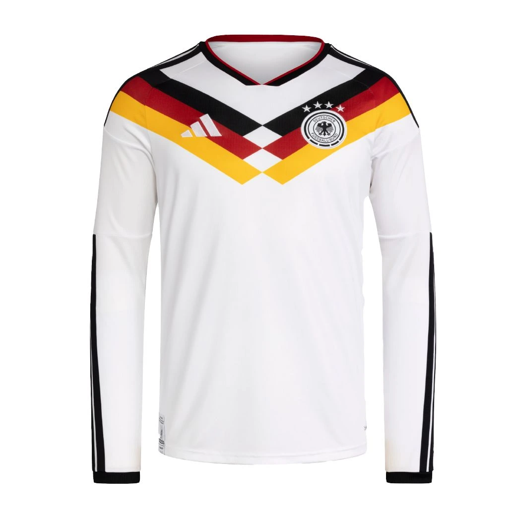 Where football legacy meets next-gen style, the Germany 26 Home Replica Long Sleeve Jersey blends iconic design cues from legendary moments with cutting-edge tech to create a future classic. Tailored with a slim fit, it hugs close for a clean, athletic look. The laid-on 3-Stripes and embroidered adidas logo and club crest bring that authentic edge. Stay cool under pressure thanks to Climacool tech that wicks and disperses sweat for a cool, dry, and distraction-free performance. Sweat-wicking materials are strategically engineered into targeted zones to help you stay dry and comfortable throughout the match. The EQT-style collar adds a retro nod, while the quick-dry fabric keeps you fresh from kickoff to final whistle.