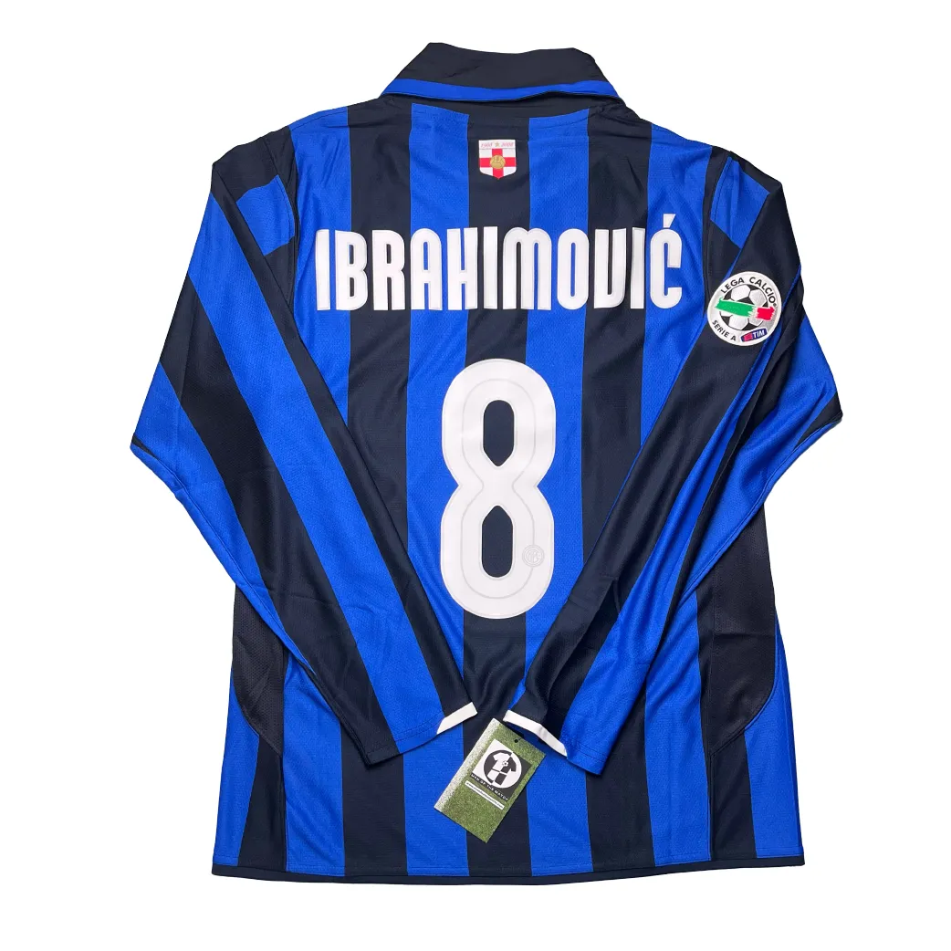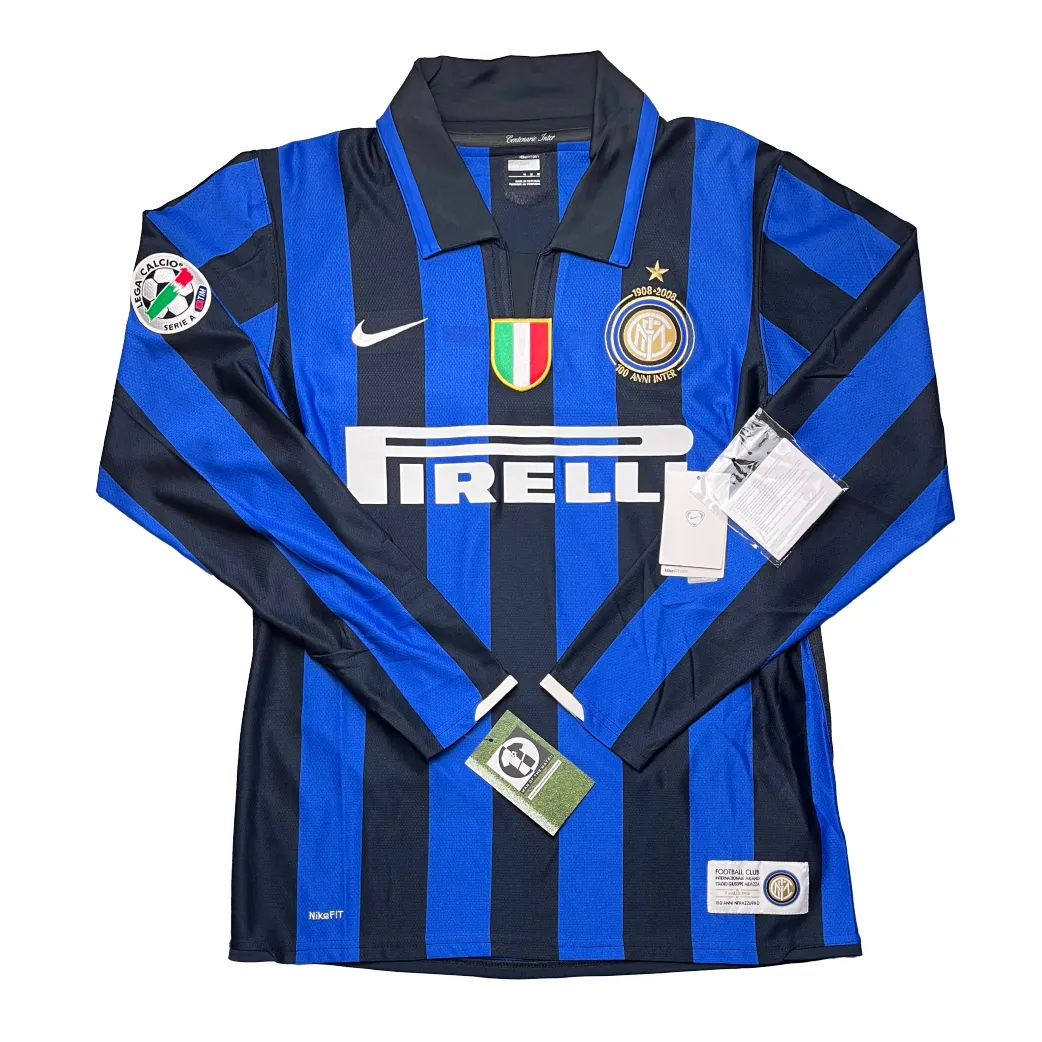 Home shirt released to commemorate the centenary of FC Internazionale Milano, worn during a dominant season that culminated in the club’s third consecutive Scudetto title. The design maintains the legendary Nerazzurri blue and black stripes, elevated with premium gold detailing and a special anniversary crest to mark 100 years of “Pazza Inter” history. Under Roberto Mancini, the squad reached the pinnacle of Italian football with Zlatan Ibrahimović finishing as the club’s top scorer, supported by the midfield tenacity of Javier Zanetti and Patrick Vieira in one of the most iconic lineups in the club’s modern era.