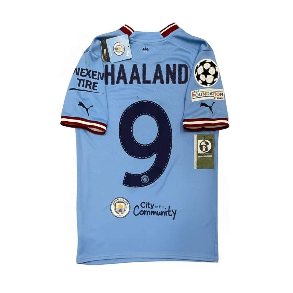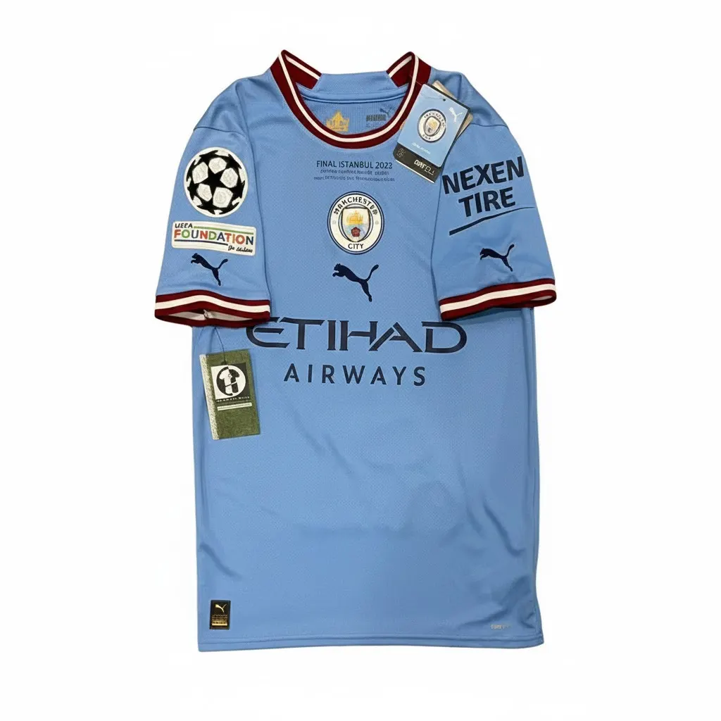 Home shirt as worn when Manchester City completed a historic Continental Treble, cementing their place as one of the greatest sides in English football history. The season was defined by the unstoppable form of Erling Haaland, who shattered the Premier League scoring record with 36 goals, alongside the midfield mastery of Kevin De Bruyne and İlkay Gündoğan. The campaign culminated in a magical night in Istanbul where a Rodri strike secured the club’s first-ever Champions League title.