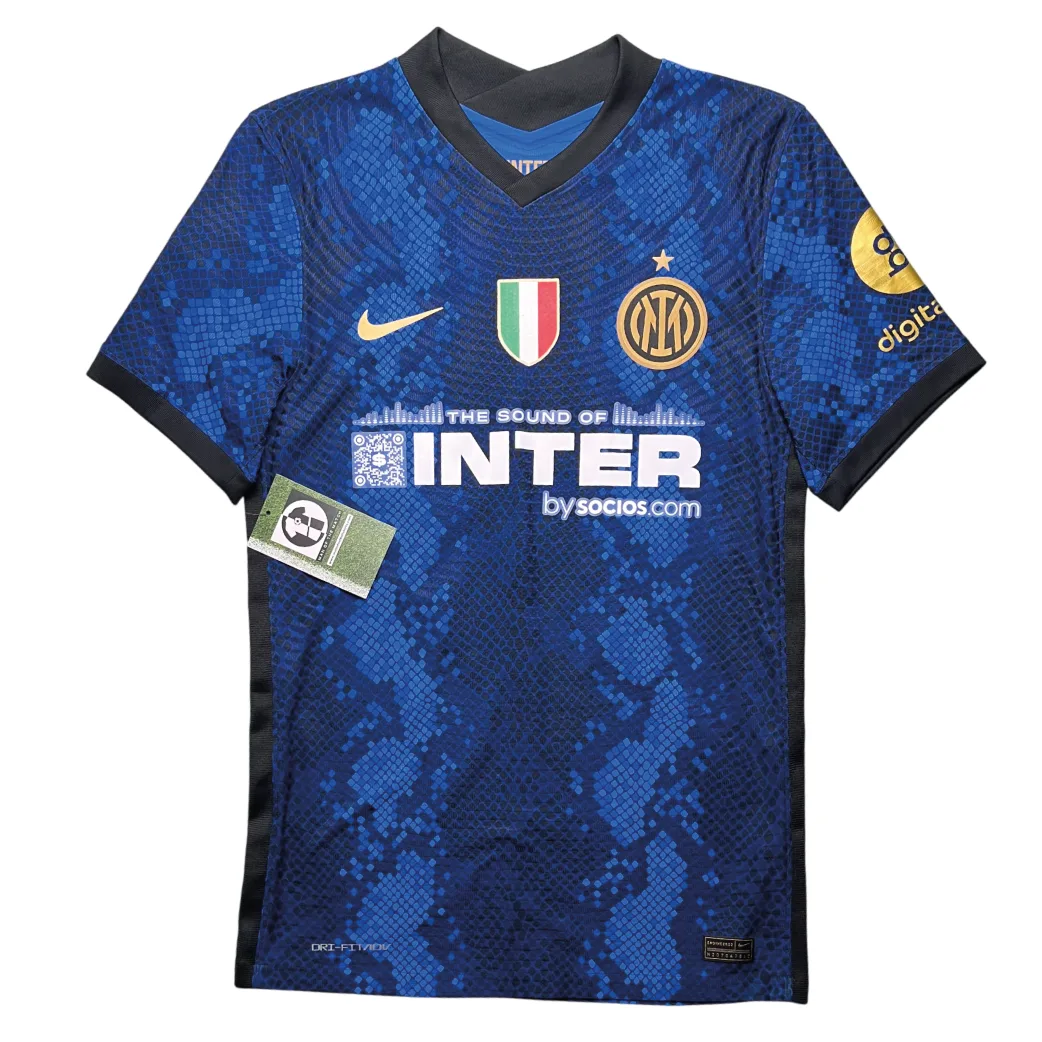 Revolutionary home shirt worn during the 2021/22 campaign as Inter Milan secured a domestic cup double, lifting both the Coppa Italia and the Supercoppa Italiana. The design features a striking “Blue Depth” snakeskin pattern, a bold reimagining of the traditional Nerazzurri stripes that pays homage to the ‘Biscione’—the historic serpent symbol of the city of Milan. Graced by the midfield engine Nicolò Barella and the clinical Lautaro Martínez, this kit marked the dawn of a new identity for the club, featuring the debut of the redesigned minimalist crest on a global stage.