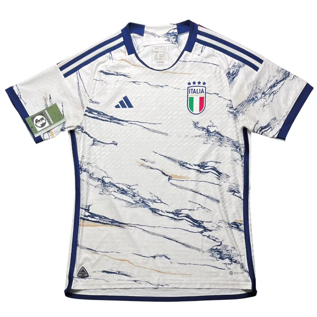 A stunning away shirt marking the beginning of the historic partnership between the FIGC and Adidas, released for the 2023/24 international season. The design features a sophisticated “Off-White” base with an intricate “Marble” pattern—a tribute to the timeless beauty of Italian architecture and the country’s profound artistic heritage. Graced by the creative vision of Federico Chiesa and the tenacity of Nicolò Barella, this kit’s unique texture and gold accents offer a premium “lifestyle” look that perfectly blends the elegance of the Renaissance with the demands of modern elite football.