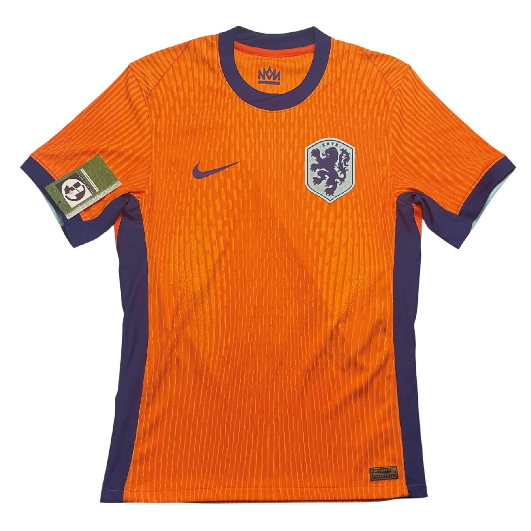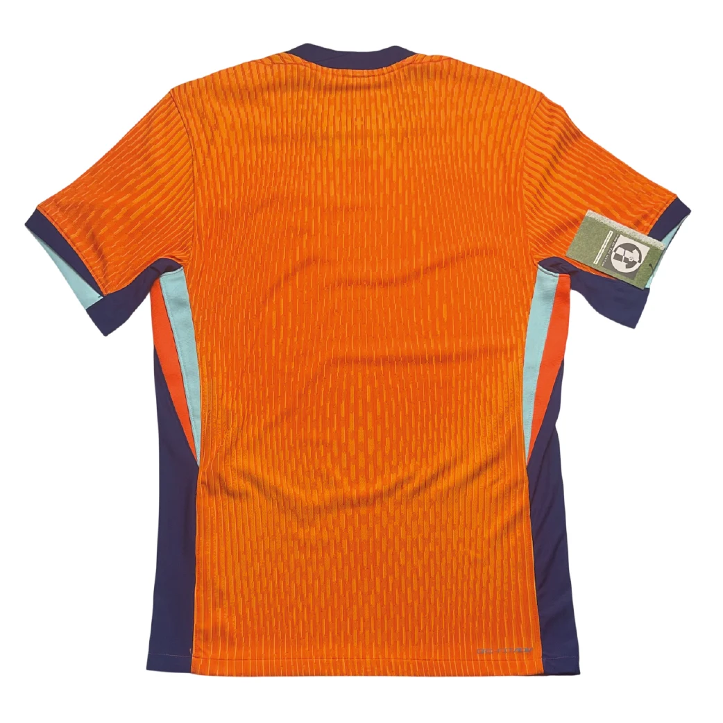 Home shirt as worn during the UEFA Euro 2024 tournament in Germany, where the Oranje showcased their trademark attacking flair to reach the semi-finals. The design features a striking “Brilliant Orange” base with deep blue and teal accents, marking a return to a more classic and powerful color palette for the KNVB. Under Ronald Koeman, this shirt was graced by a world-class squad featuring Virgil van Dijk, Xavi Simons, and Cody Gakpo, famously worn during the dramatic knockout victories over Romania and Turkey as the side revitalized the nation’s “Total Football” spirit on the grandest European stage.