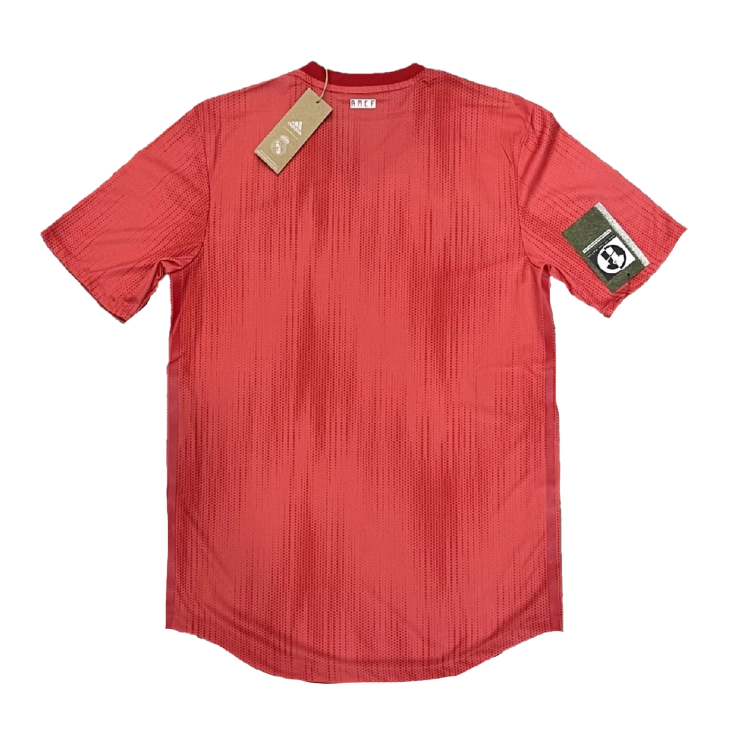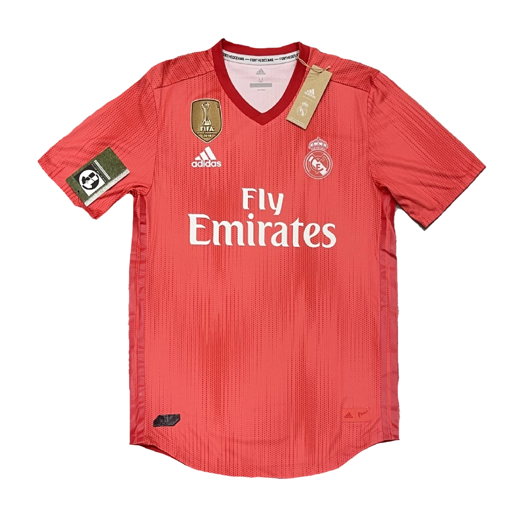 Player Edition third shirt as worn during a season of significant transition following the departures of Zinedine Zidane and Cristiano Ronaldo. The eye-catching “Coral” design was crafted from upcycled marine plastic waste in partnership with Parley for the Oceans, serving as a symbol of eco-innovation and the club’s commitment to marine conservation. Despite a turbulent domestic campaign, the side secured their seventh world title by winning the FIFA Club World Cup, with world-class performers like Luka Modrić—who claimed the Ballon d’Or during this season—and Karim Benzema leading the squad under the returning Zinedine Zidane.