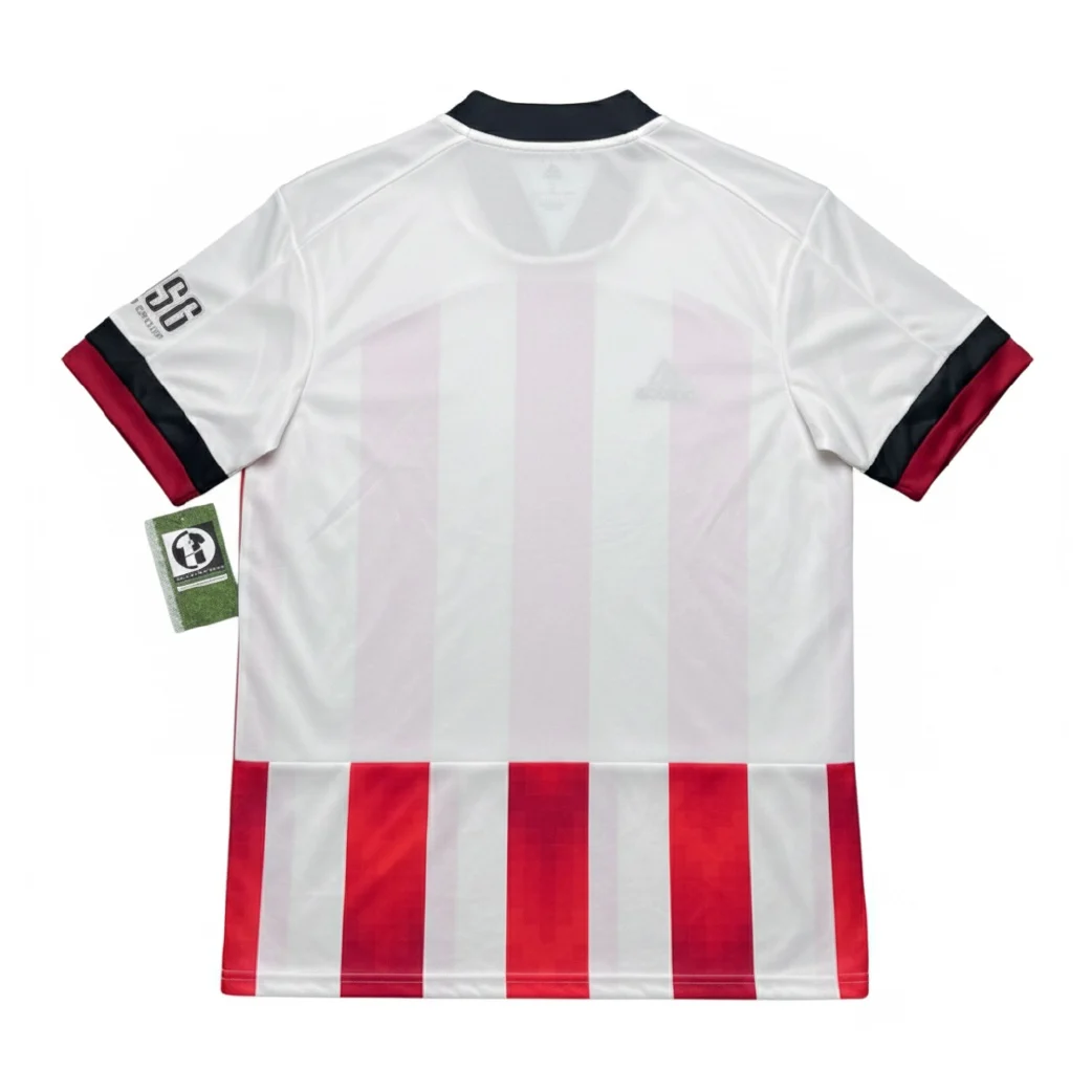 Home shirt as worn by the Blades during a challenging campaign in the Premier League following their impressive top-half finish the previous year. The design features the club’s traditional red and white stripes, updated with a modern “pixelated” or serrated edge effect on the black borders, and a solid white back for player name clarity. Despite a difficult season on the pitch, the side remained competitive under Chris Wilder and later Paul Heckingbottom, with veteran striker David McGoldrick leading the scoring charts and academy graduate Aaron Ramsdale earning the Player of the Year award for his heroic performances in goal.