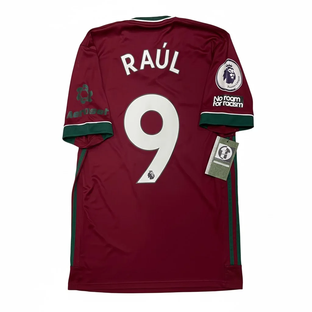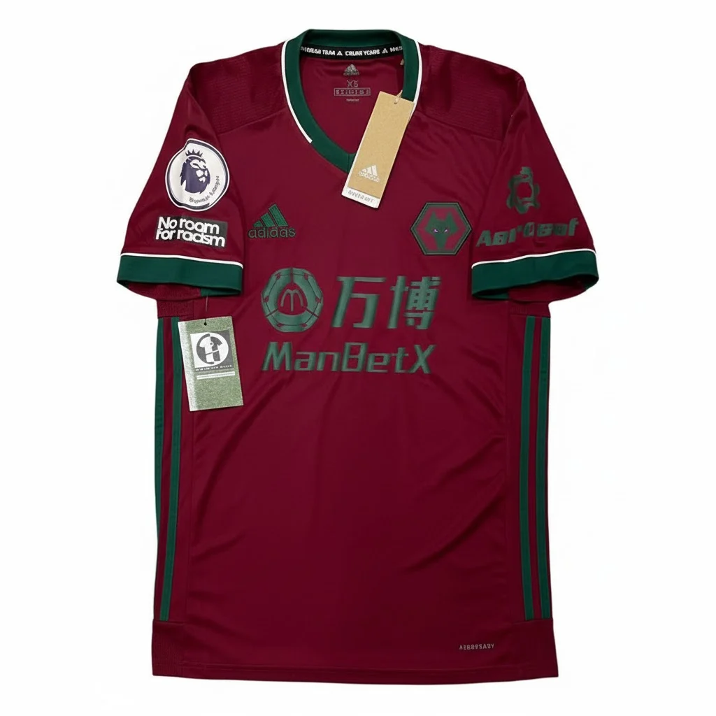 Third shirt as worn during a season of consolidation in the Premier League as Wolves continued to compete at the top level under Nuno Espírito Santo. The bold maroon and green colorway served as a stylish nod to the club’s strong Portuguese influence, which had become a core part of their identity. Despite a challenging campaign following a serious injury to star striker Raúl Jiménez, the side remained a resilient force, powered by the technical quality of Pedro Neto and the midfield control of João Moutinho and Rúben Neves.